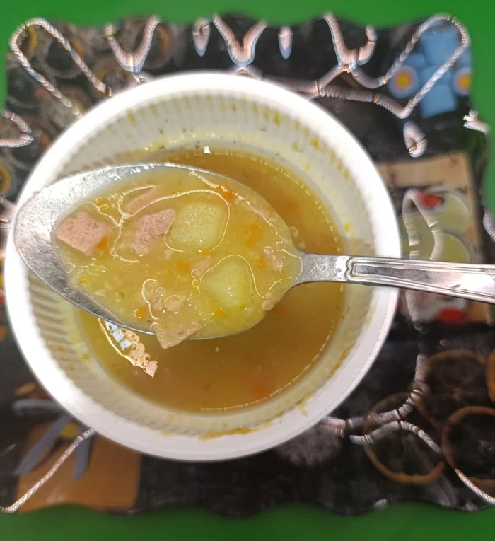 А знаете что, это не ужасно, горох чувствуется, сам суп приятный по специям сбалансированный, такой лёгкий ненавязчивый продукт, если бы не "мясо". В составе написано что это колбасное изделие, но выглядит как кошачий корм или продукт из сои. Съесть можно при желании, но лучше не надо.