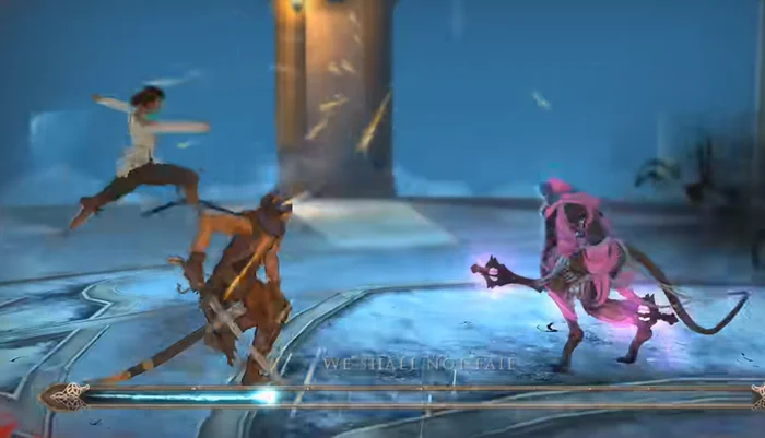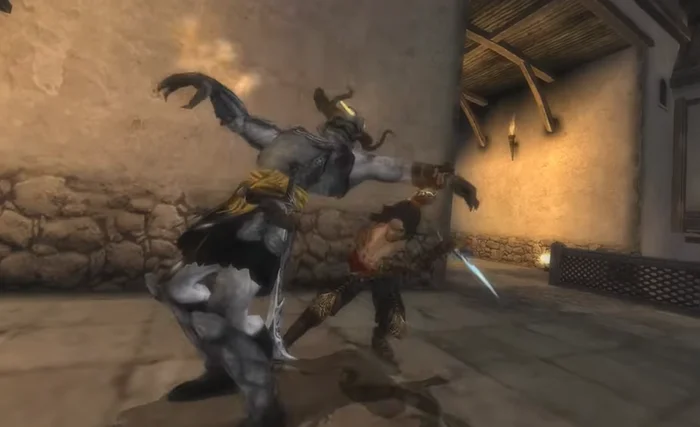 - В-третьих, принц будет периодически перемещаться между двумя временными линиями, и в одной из них его постоянно будет преследовать хранитель времени Дахака, которого нельзя уничтожить. Единственное, что можно будет сделать, это убежать от него, спрятавшись за водной преградой;