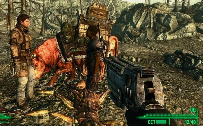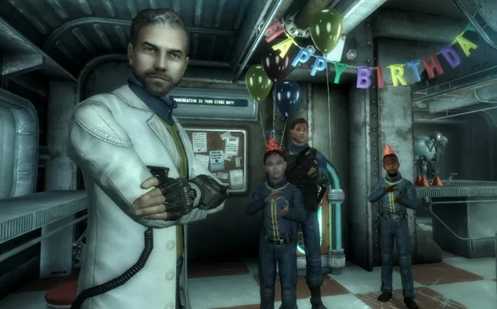 Затем идет довольно обширная сцена с нашего десятого дня рождения, где мы узнаем про главного гопника убежища (которого, правда, позже можно будет взять в напарники), получим свой личный Пип-Бой, а также вместе с отцом будем учиться стрелять, тренируясь на радтараканах.
