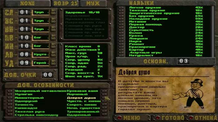 Из дополнительных особенностей можно выбрать "Добрую душу", благодаря чему наши боевые навыки будут ниже, зато такие навыки как красноречие, первая помощь и бартер будут гораздо лучше. Ну и вдовесок можно взять способность "Тренированный", из-за которой мы будем получать дополнительные перки 1 раз в 4 уровня (а не в 3), но благодаря которой наши навыки будут чуть выше.