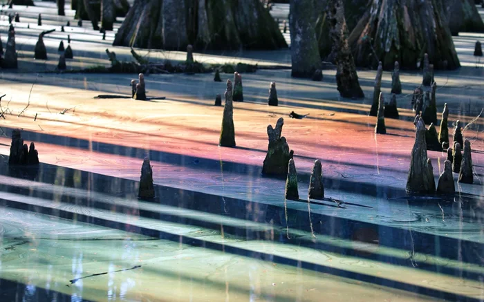 Лес здесь затоплен, почва покрыта тонким слоем воды. И зимой при определенном освещении вода превращается в исполинских размеров радугу. Лишь редко стоящие кипарисы разбивают ее своими тенями. Особенно хорош эффект, когда солнце стоит низко и свет проникает сквозь деревья под идеальным углом.