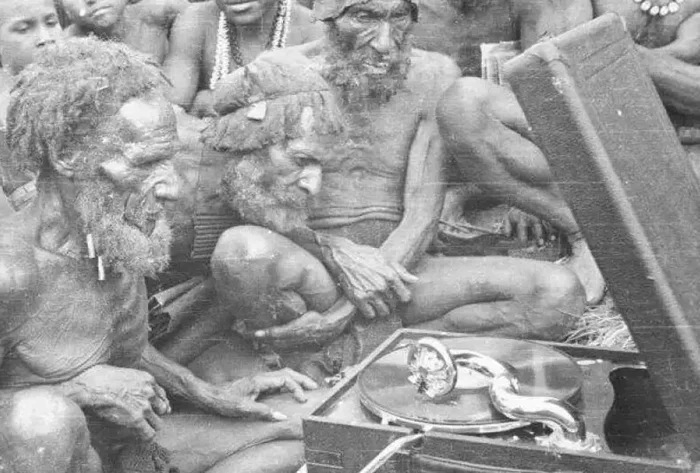 Прослушивание патефона. Папуасы подумали, что из этой коробки им напевают духи предков