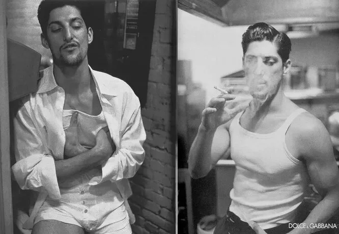 И вот мы подходим к 1990-м годам, когда майка наконец-то стала полноправным игроком модного мейнстрима. И тут надо отдать должное итальянскому модному дому Dolce&Gabbana. Дизайнеры Доменико Дольче и Стефано Габбана вспомнили про образ сексуального итальянского парня, который когда-то был осмеян и ошельмован в Америке, и решили его романтизировать. Они показали майки в своей рекламной кампании 1990 года, а затем и вывели их на подиум.