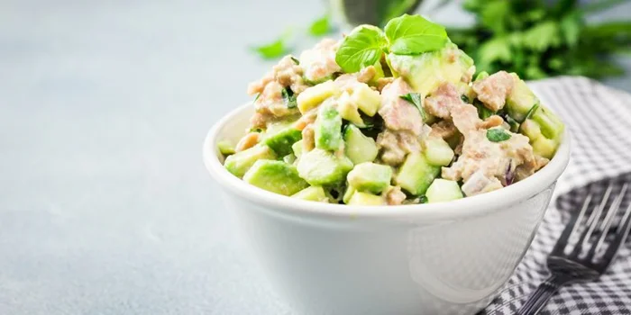 Нарежьте авокадо и огурец средними кусочками, сельдерей и лук — мелкими. Добавьте тунца, зелень, масло, лимонный сок, соль и перец. Немного помните авокадо вилкой и перемешайте.