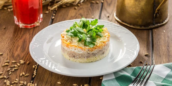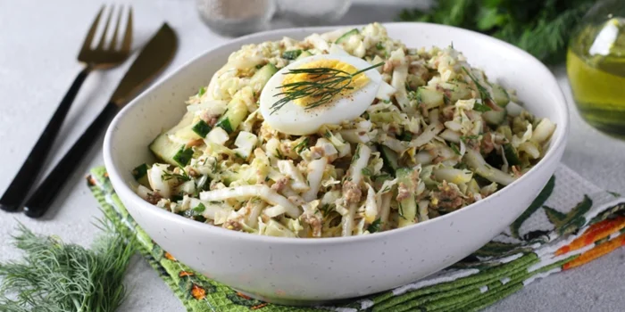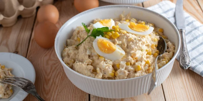 Классический салат с консервированным тунцом, кукурузой и яйцами