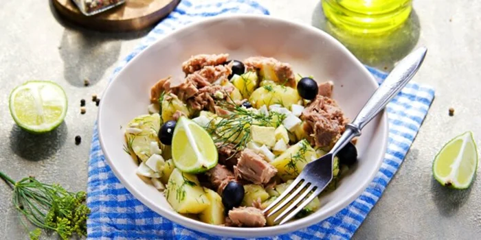 Сварите картофель и яйца, остудите. Нарежьте крупными кусочками, добавьте тунца, укроп, оливки, соль и перец. Смешайте цедру и сок лайма с маслом, заправьте салат.
