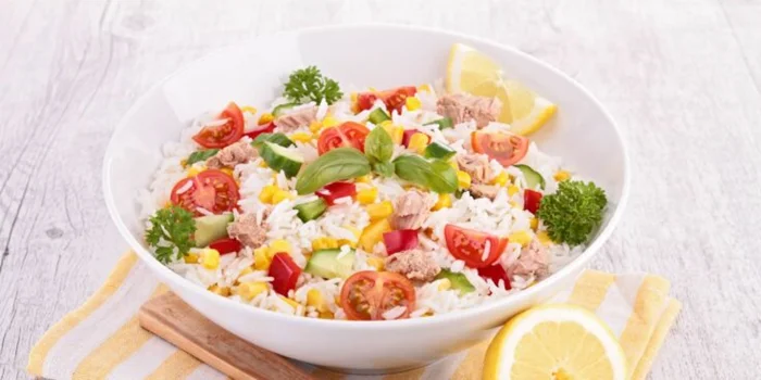 Отварите рис, остудите. Нарежьте овощи, смешайте с тунцом, рисом и кукурузой. Заправьте смесью из горчицы, масла, соли и перца.