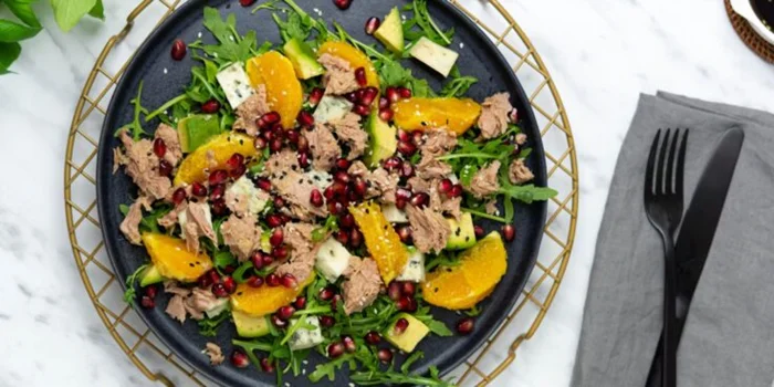 Очистите апельсин от плёнок, разрежьте дольки на несколько частей. Авокадо и сыр нарежьте небольшими кусочками, сбрызните лимонным соком. Смешайте тунца, сыр, авокадо, апельсин и руколу. Слегка посолите, добавьте масло и зёрна граната.