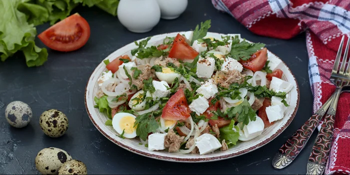 Салат с тунцом, помидором, перепелиными яйцами и фетой