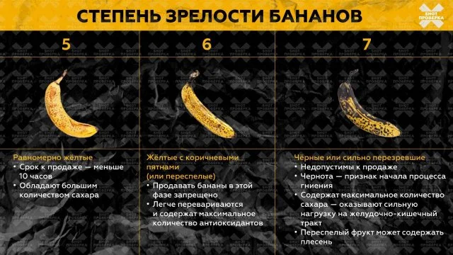 Остальные стадии лучше не трогать — такие бананы могут содержать вредные химические вещества или скрытую плесень. Так что, если у вас лежат зеленые бананы, просто дайте им пару дней дозреть.