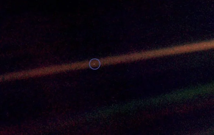Эта историческая фотография сделана в 1990 году. Называется она "бледно-голубая точка". Это максимально далекое расстояние на котором когда-либо была сфотографирована Земля. И сделал ее "Вояджер" когда готовился к отлету за пределы Солнечной системы.