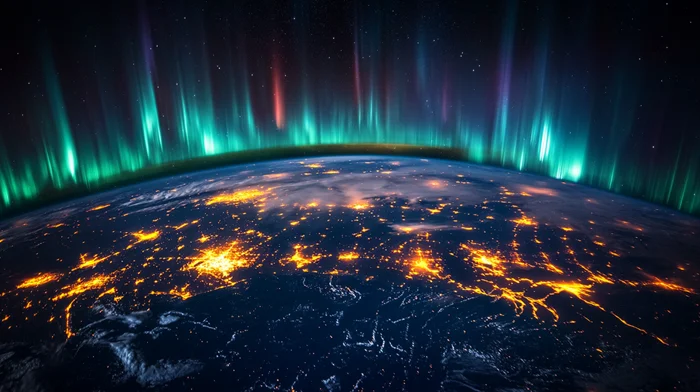 Это верхний слой атмосферы, насыщенный заряженными ионами. Там сталкивается наша атмосфера с агрессивными космическими лучами. Излучение атомов при столкновении с нашей магнитосферой приводит к полярному сиянию.