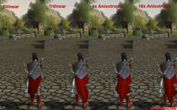 Дело в том, что пиксели могут располагаться по отношению к игроку под углом или на каком-либо расстоянии. Так вот, фильтрация попиксельно разбирает текстуру, заново просчитывает положение и дистанцию текстуры (пикселей) и выводит на экран. В зависимости от типа фильтрации текстур будет меняться качество картинки в игре. Например, обратите внимание на дальние мыльные текстуры слева и на дальние более детальные текстуры справа.