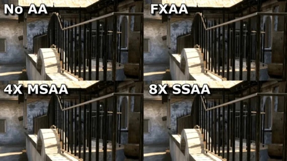 MSAA (MultiSample Anti-Aliasing) - работает лучше, но не идеально. Больше кушает производительность. У MSAA есть несколько типов: 2x, 4x, 8x, 16x. Соответственно. чем выше значение - тем больше количество сглаживаемых пикселей, тем больше нагрузка.