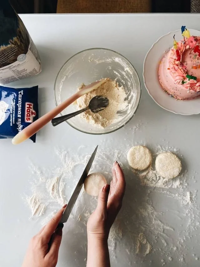 — Присыпьте рабочую поверхность мукой, сформируйте небольшие кругляши, придавая им форму сырников с помощью ножа;