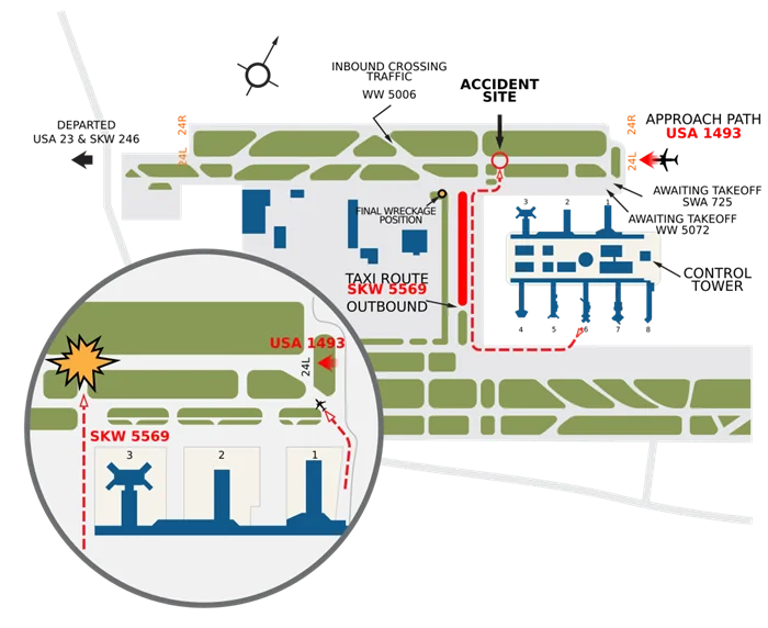 Для краткости далее будем называть эти самолеты "Боинг" и "Метро". Итак, Боинг подлетал к Лос-Анжелесу с целью совершить посадку, а Метро намеревался взлететь из Лос-Анжелеса в Палмдейл. На бортах были опытные экипажи, а самолеты были достаточно молодыми: Боинг находился в эксплуатации 6 лет, а Метро 4 года.