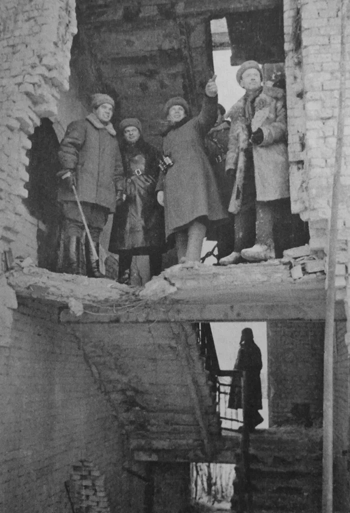Командарм-62 генерал-лейтенант Василий Иванович Чуйков (слева) и его подчиненные в разрушенном здании в Сталинграде. В центре стоит командир 284-й стрелковой дивизии полковник Николай Филлипович Батюк. 01.01.1943