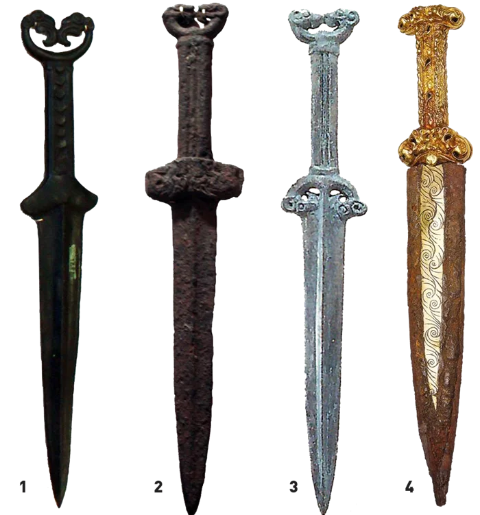 - Акинаки — короткие мечи, которые носили на правом бедре. Длина клинка: 40-60 см. Материал: преимущественно железо, реже бронза.