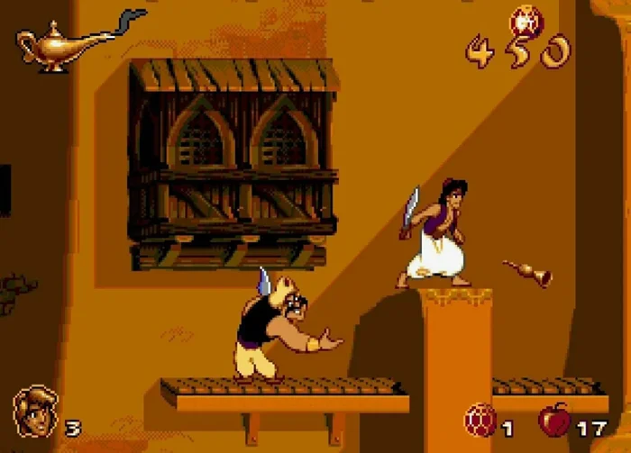 Я не мог не упомянуть "Disney's Aladdin", так как это мой любимый мультфильм. Игра имела схожую графику на разных платформах, но отличия заключались в индикаторах здоровья. В Sega здоровье отображалось лампой, а на ПК - Джинном с песочными часами.