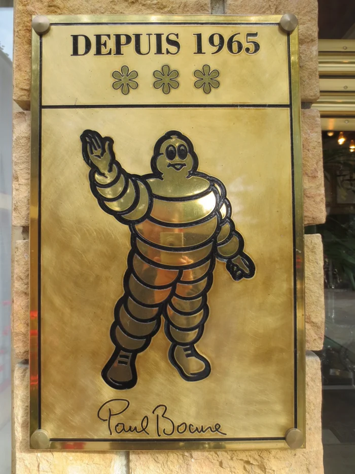 Табличка с упоминанием количества звёзд при входе в ресторан Поля Бокюза,. Этот ресторан получал 3 звезды ежегодно с 1965 года до смерти Бокюза в 2018 году
