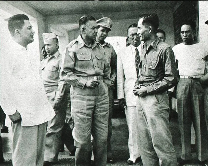 Луис Тарук (справа), лидер повстанцев Хуков и основатель коммунистической борьбы на Филиппинах, сдается генерал-майору Варгасу в 1954 году.