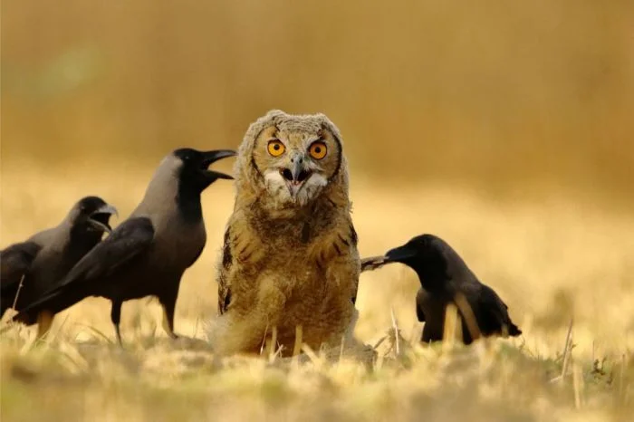 Вороны и совы ненавидят друг друга и инстинктивно нападают друг на друга на месте, даже если до этого они не сталкивались.