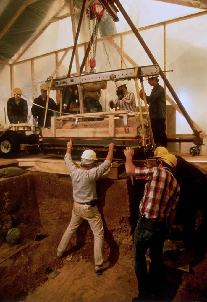 Осторожно удалив почву под гробами, под каждый из них ввели стальную пластину. Каждый гроб помещали на специальную люльку, поднимали из ямы и перевозили в лабораторию. Самым сложным оказался подъем большого гроба, весившего около 700 кг.