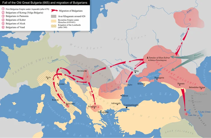 После распада Великой Болгарии часть булгар во главе с ханом Аспарухом ушла на Дунай и основала Первое Болгарское царство, став предками современных болгар. Другая часть булгар переселилась в Среднее Поволжье - так и появилась Волжская Булгария.