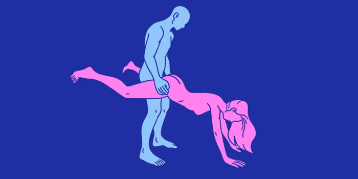 Женщина опирается руками на пол, а ноги обхватывают талию мужчины, который входит в неё сзади.