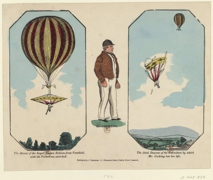 Роберт Кокинг (1776-1837) погиб, когда его самодельный парашют не сработал. Причиной стали большой вес парашюта (около 115 кг) и его хрупкая конструкция.