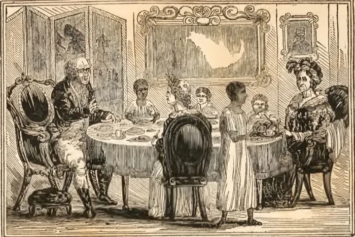Темнокожие рабы обслуживают американскую семью за столом. Гравюра.