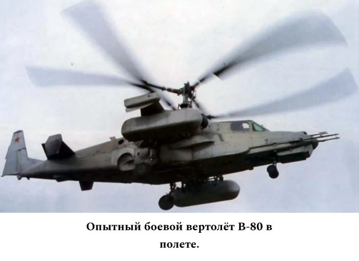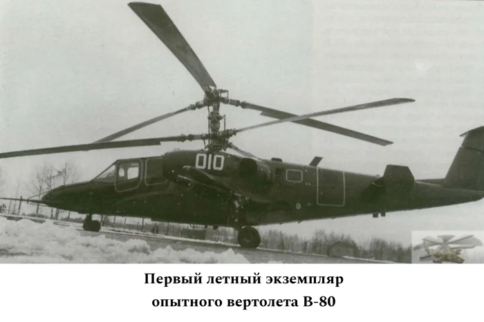 Первый полет новая машина совершила 17 июня 1982 года, а 2 августа 1983 года в воздух поднялся второй опытный экземпляр В-80. Когда камовцы представили свой вертолет военным, они были поражены. Одноместная машина соосной схемы с вытянутым фюзеляжем и интеллектуальной системой управления оружием была для них полной неожиданностью! Однако после первых демонстрационных полетов и изучения расчетов стало ясно, что новинка не просто имеет право на существование, но и может оказаться более практичной и выгодной для армии, чем разработанный Ми-28 классической схемы. В течение двух лет проводились сравнительные испытания вертолетов, и мнения армейских экспертов все больше склонялись в пользу В-80. В сентябре 1985 года комиссия Министерства обороны приняла решение выбрать машину ОКБ имени Камова в качестве серийного ударного вертолета.