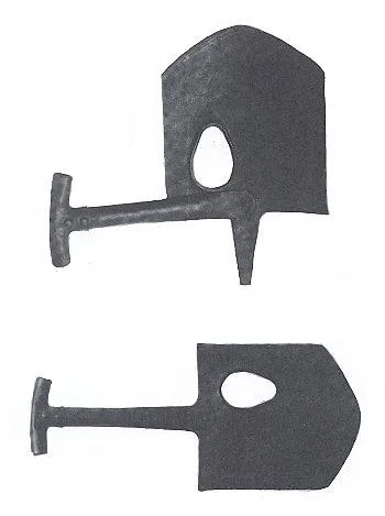 Давайте внимательнее рассмотрим лопату-щит Хьюза. Она представляла собой толстую стальную пластину (примерно 5 мм) с отверстием. Предполагалось, что через это отверстие солдат сможет вести огонь и наблюдать за противником. Рукоять лопаты имела необычную конструкцию, позволяя поворачивать её на 90 градусов относительно лезвия.