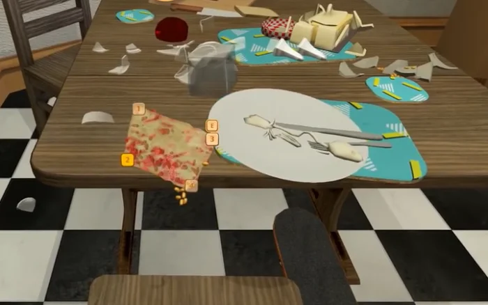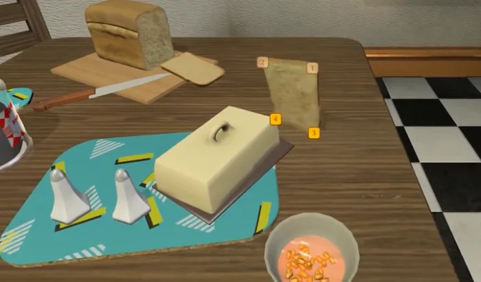 Игра начинается на кухонном столе, где расположены такие известные предметы, как масленка, банка с джемом, нож и т.д. И самое интересное, что мы можем взаимодействовать со всеми этими предметами. Например, можно подпереть масленку, чтобы снять с нее крышку, а затем намазаться маслом. Но это не главная наша цель.