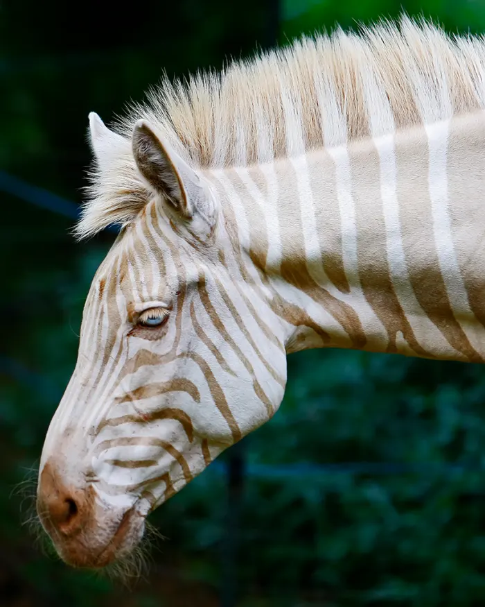 На Гавайях обитает зебра с золотыми полосами вместо черных. Этот необычный цвет обусловлен аномалией пигментации — амеланизмом.