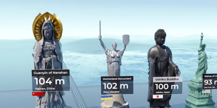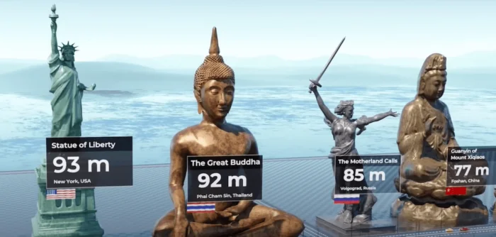 «Родина-мать зовёт!» в Волгограде (85 метров), Большой Будда в Таиланде (92 метра) и статуя Свободы в США (93 метра)