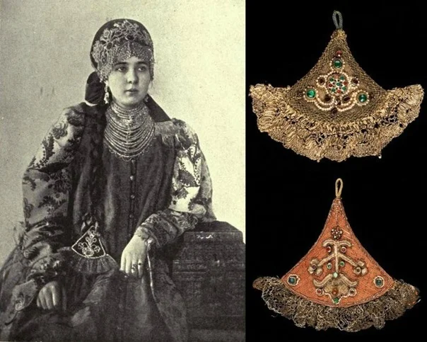 Кокошник в виде шапочек с высоким очельем и плоским округлым верхом.