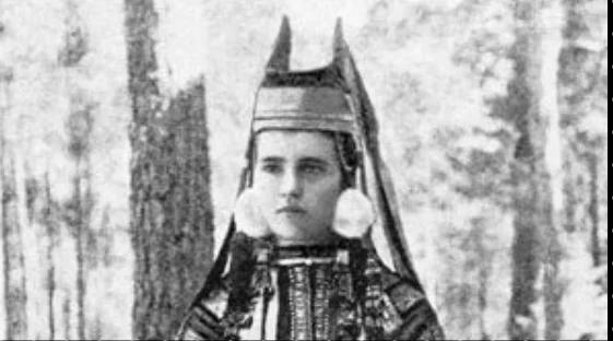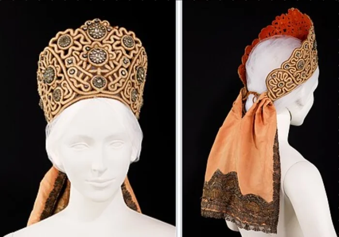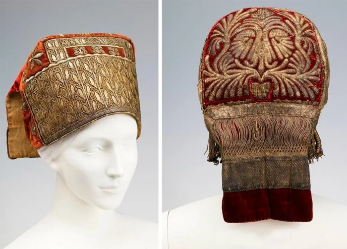 Кокошник, сшитый в виде конуса с удлиненной передней частью, украшался золотошвейной вышивкой или «шишками», которые символизировали культ плодородия.