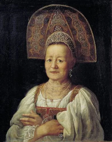 В 15-17 веках кокошник был атрибутом состоятельных женщин, боярынь и цариц. У крестьянок он встречался редко, так как они чаще носили сороки. После реформы Петра I кокошники стали атрибутом богатых крестьянок и купчих. Многие купцы были выходцами из крестьян, поэтому на портретах купчих женщины часто изображены в традиционных головных уборах.