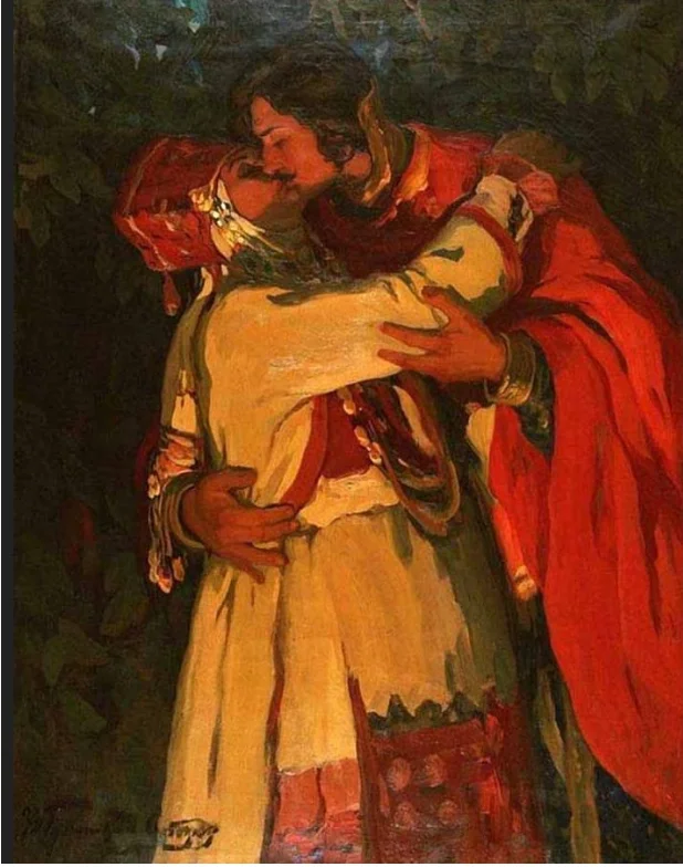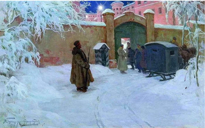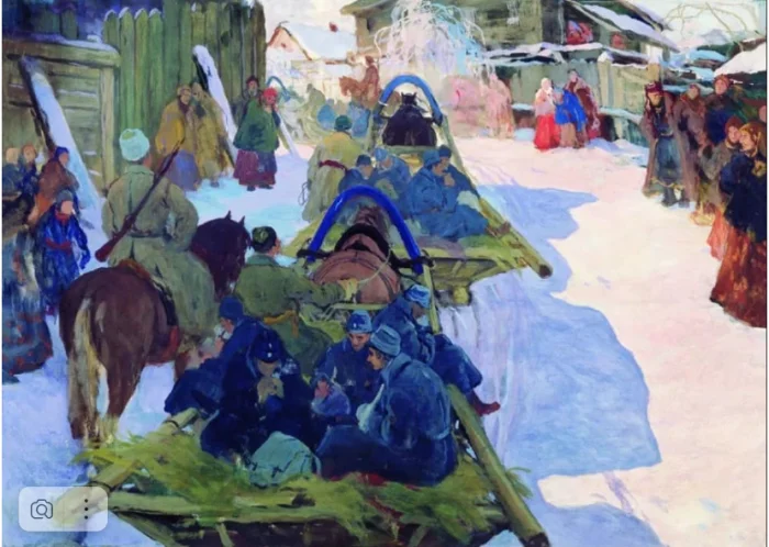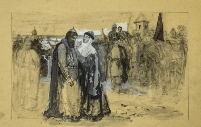 Я с трепетом ждал, когда он заговорит. Он взял стул, сел на расстоянии и сказал: «знаете, Горюшкин! Вы голову у “Скрипача” больше не пишите, она вам очень удалась, ведь если я не ошибаюсь, вам позирует Светлицкий! Ах! Он удивительно хорошо играет на скрипке! Я его слышал на ученических вечерах. Он у вас очень похож. Рука на грифе вам трудно даётся, но я верю в вас, Горюшкин, вы напишите». Затем он спросил, нет ли у меня эскизов. Я показал ему один из начатых эскизов к “Слову о полку Игореве”. Илья Ефимович сразу определил тему этого эскиза: “Ах! Это если я не ошибаюсь, “Прощание Ярославны”. Вот вам прекрасный сюжет для конкурсной вашей картины, ведь вы уже скоро должны выступить на конкурсе. И я советую вам непременно писать эту картину”.