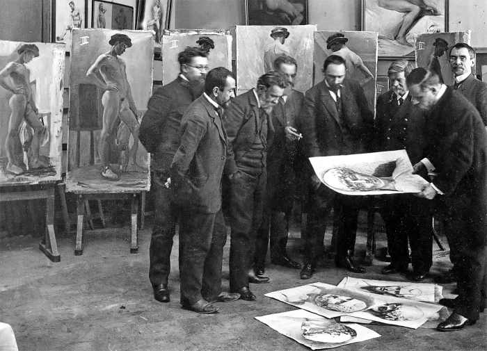 Рисовальный класс училища, обсуждение работ студентов, после 1910 г.