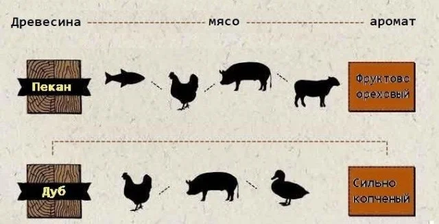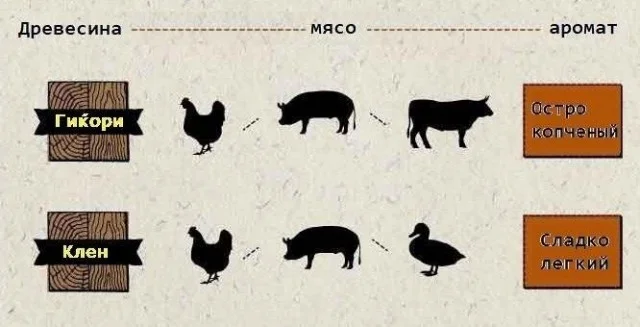 Давайте рассмотрим, как щепа из различных древесных пород влияет на характер копчёных блюд.