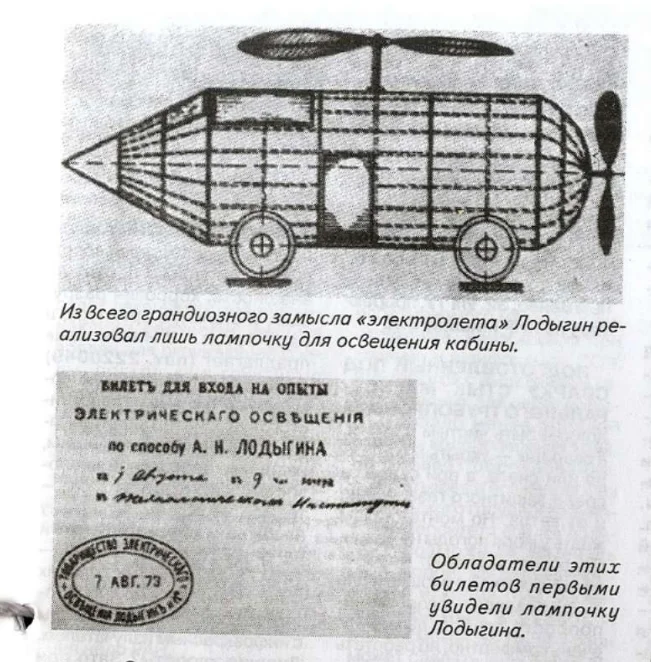В-третьих, есть интересная версия, что именно работа над системой освещения для кабины «Электролёта» (чтобы пилот мог видеть приборы ночью) подтолкнула Лодыгина к его главному изобретению – лампе накаливания. А если это так, то «Электролёт», пусть и не взлетев, косвенно подарил электрическое освещение.