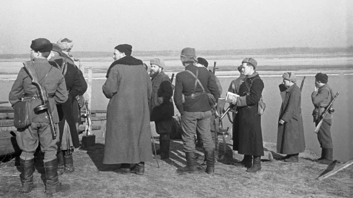 Пётр Вершигора (в центре) с партизанами во время прослушивания сводки Совинформбюро. 1944