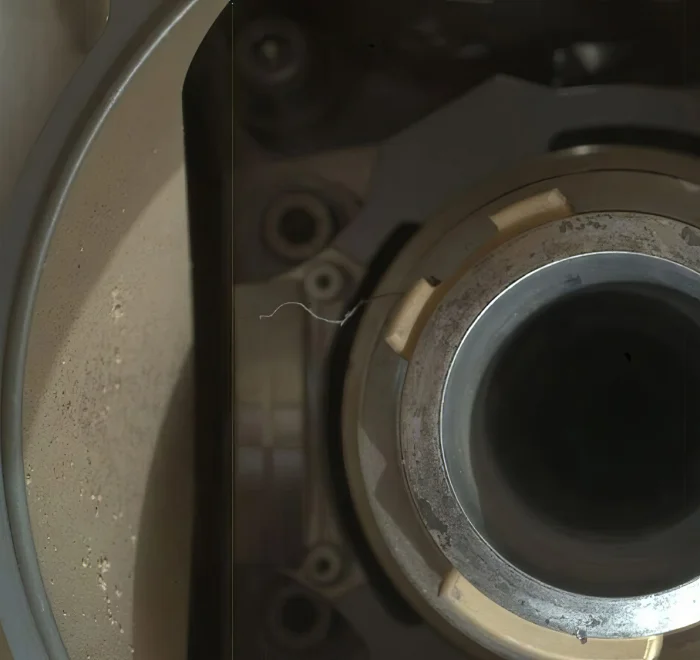 Волосяной объект отчётливо виден на полученном снимке. Объект напоминает развязанную нить, державшую пуговицу на рубашке. Подобные объекты беспокоят команду исследователей тем, что они могут привезти к загрязнению контейнера с образцами марсианского грунта.