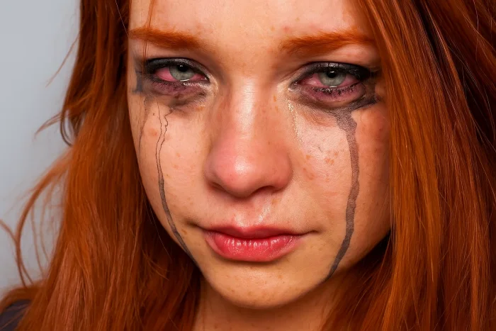 Чёрные разводы от слёз или слюны усиливают визуальную «жесткость» сцены. Это приём, а не стихийный «бардак».
