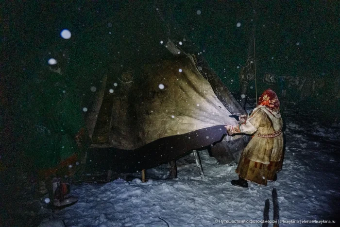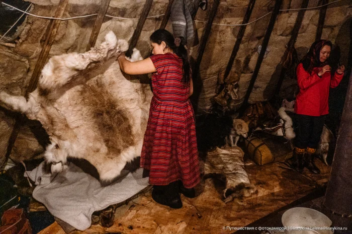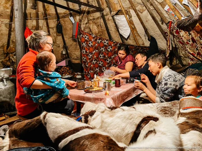 За стенами чума мороз стоит минус тридцать градусов, но я уютно устроилась в шкурных одеждах и с интересом наблюдаю, как хозяйка Лина с легкостью помешивает суп в котелке, который стоит на печке. "Сегодня тепло", - говорит она с улыбкой. "Когда температура опускается до -50°C, тогда можно действительно говорить о холоде". За пологом чума простирается бескрайняя и суровая тундра, где ветер пронизывает до костей.