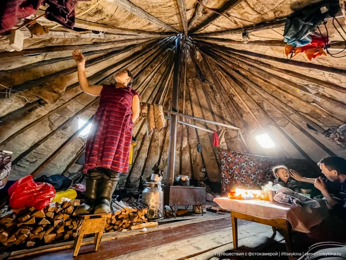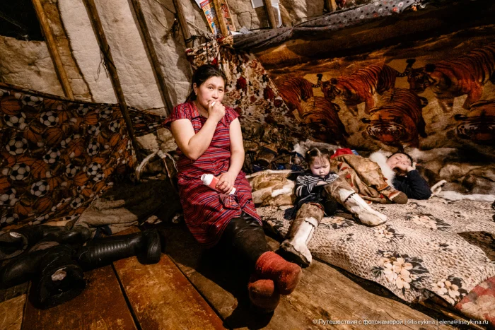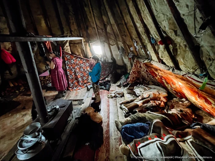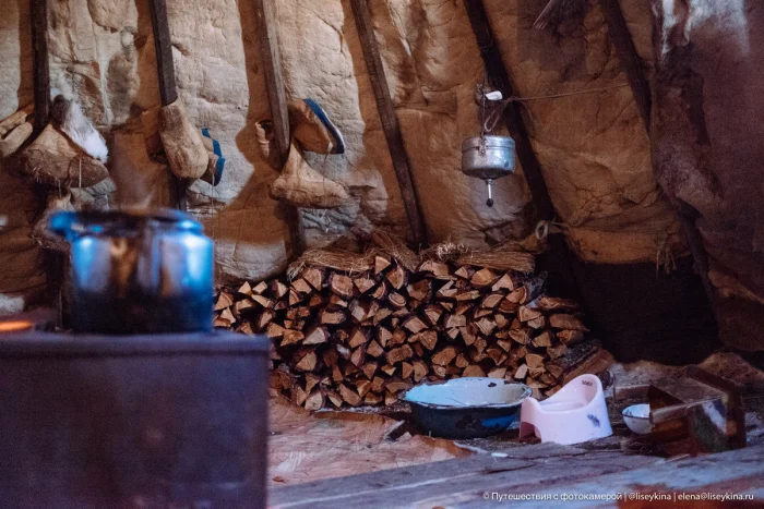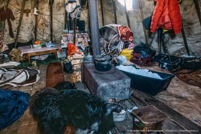 В центре чума всегда стоит железная печка-буржуйка — сердце дома. Дым выходит через отверстие в верхушке, которое никогда полностью не закрывают. Интересно, что даже в лютые морозы хозяева не поддерживают огонь ночью. "С вечера натопим хорошо, и до утра тепло держится," — говорит Лина, хотя к утру в чуме становится прохладно.