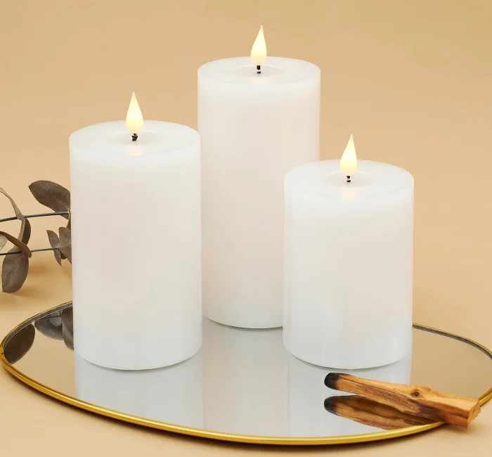 Каждая свеча оформлена с эффектом «растаявшего края», как у настоящей — это придаёт дополнительную реалистичность. А белый универсальный цвет корпуса впишется как в минималистичный интерьер, так и в уютный скандинавский или классический стиль.