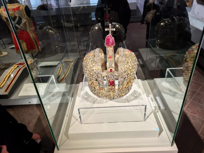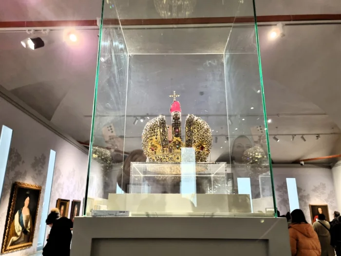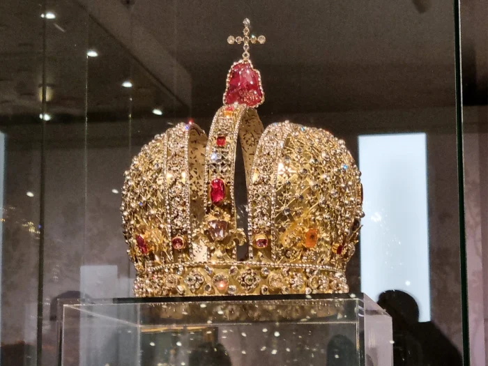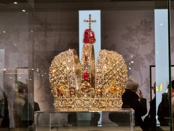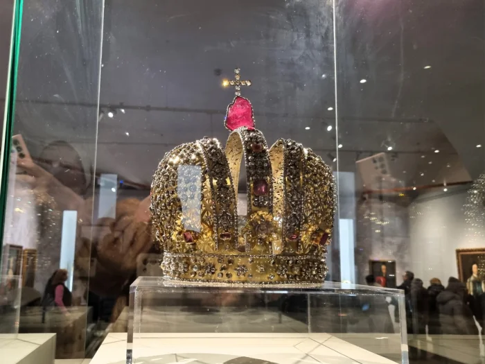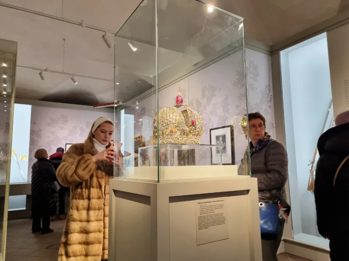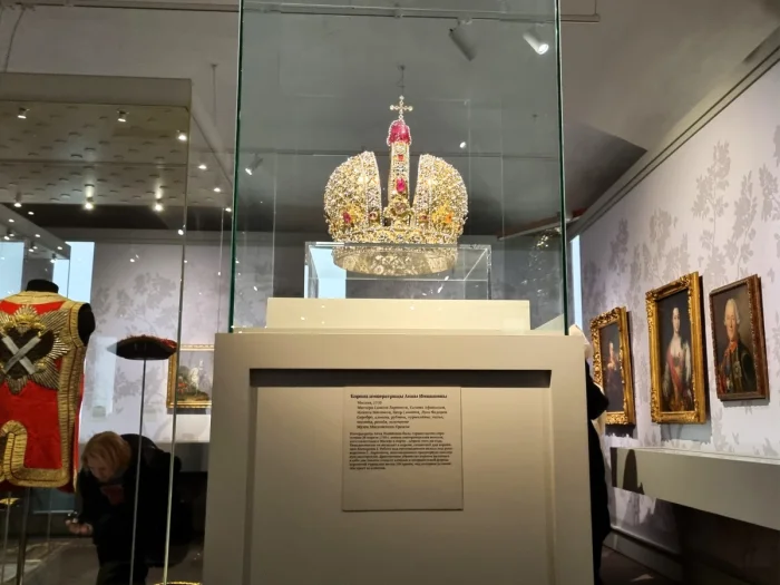 В Московском Кремле на выставке "Наследие Петра Великого и дворцовые перевороты в Российской империи" проходил интересный разговор между двумя величественными дамами. Они обсуждали драгоценный венец императрицы Анны, созданный в 1730 году к ее коронации.